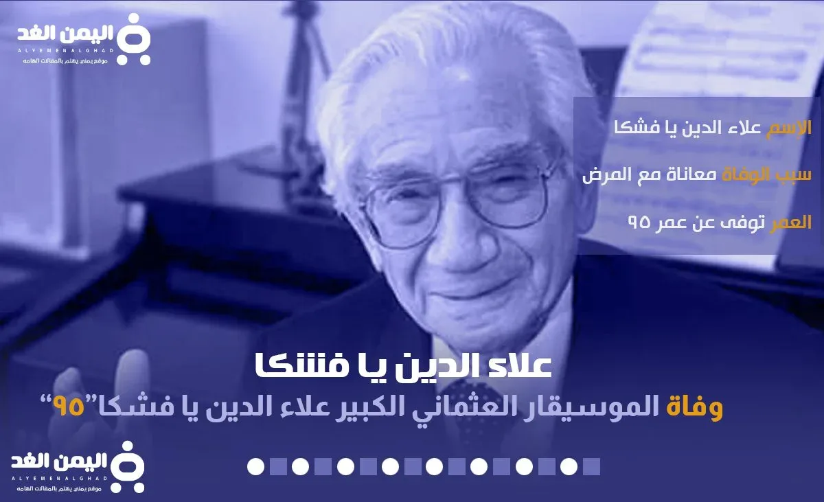 ننشر لكم تفاصيل عبر اليمن الغد حول وفاة أحد كبار وأعمدة الموسيقيين العثمانيين في تركيا ويعتبر من أشهر الموسيقيين واقدمهم وهو الموسيقار التركي وفاة علاء الدين يا فشكا الموسيقار التركي من هو Dr. Alaeddin Yavaşca hayatını kaybetti.