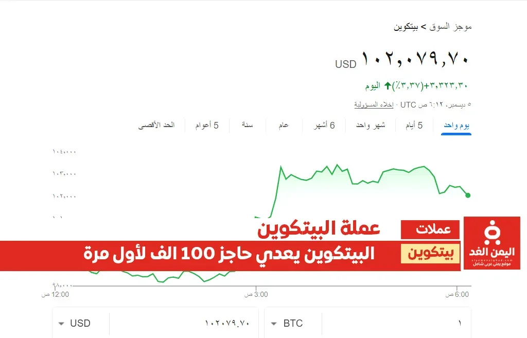 سعر البيتكوين اليوم 5-12-2024  حيث شهدت عملة البيتكوين اليوم زيادة ملحوظة في قيمتها، حيث ارتفع سعرها إلى 102,079.70 دولار أمريكي، مسجلاً زيادة بنسبة 7.37% مقارنة باليوم السابق. هذا الارتفاع يأتي بعد فترة من التقلبات الكبيرة في السوق.