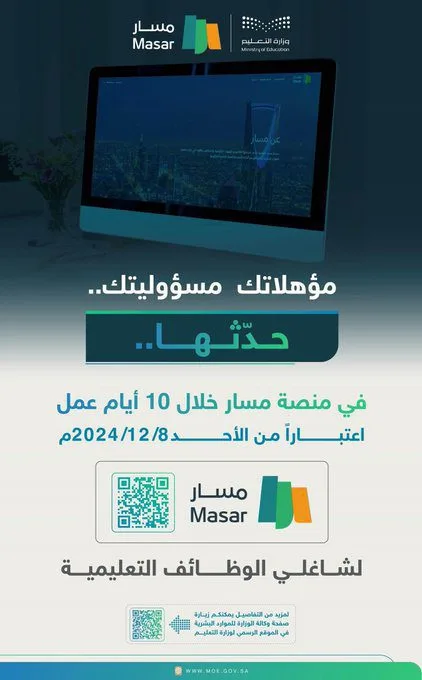 يُعلن عن أهمية تحديث المؤهلات لشاغلي الوظائف التعليمية عبر منصة مسار، مع إتاحة الفرصة لإجراء التحديث خلال 10 أيام فقط، حيث تنتهي المدة المحددة بتاريخ: