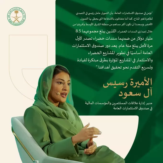 كما تمثل المملكة في مؤتمرات عالمية، مثل COP28، حيث ناقشت دور الاستثمارات المستدامة وأهميتها في مواجهة التغيرات المناخية.