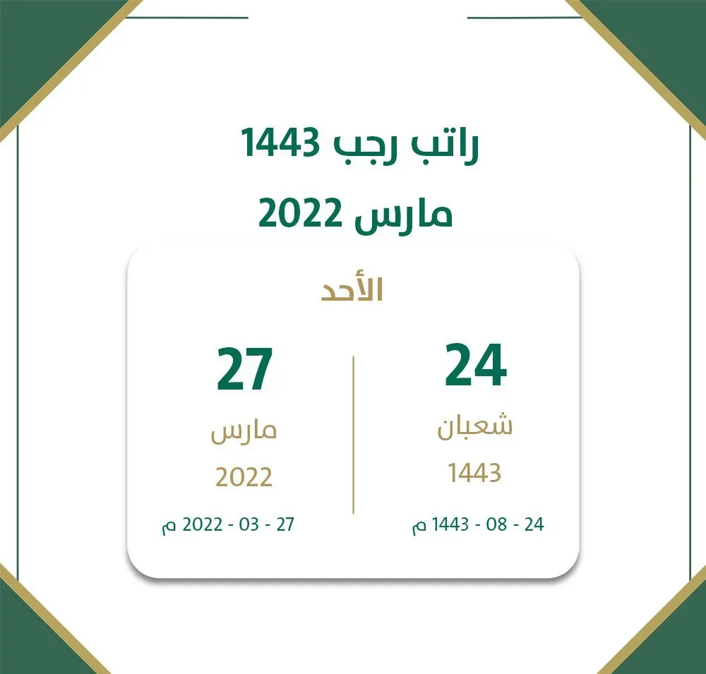 تتبنى الحكومة السعودية موعداً شهرياً تكون فيه رواتب جميع الموظفين في جميع القطاعات عامة والمتقاعدين كذلك ، في نهاية كل شهر ميلادي ، وبالنسبة لشهر شعبان الحالي ، من المتوقع أن تكون رواتب جميع المستحقين في سيتم الدفع لجميع مناطق المملكة العربية السعودية في نفس اليوم. في السابع والعشرين من آذار من العام الجاري 2022 ، الموافق الرابع والعشرين من شهر شعبان من العام 1443 ، وهو اليوم الذي تُدفع فيه رواتب الموظفين في جميع القطاعات الحكومية بشكل شهري. كل يوم من اليوم السابع والعشرين من كل شهر ميلادي ، بشرط تأجيل عملية السداد في حال صادف هذا اليوم أحد الأعياد الرسمية للمملكة العربية السعودية.