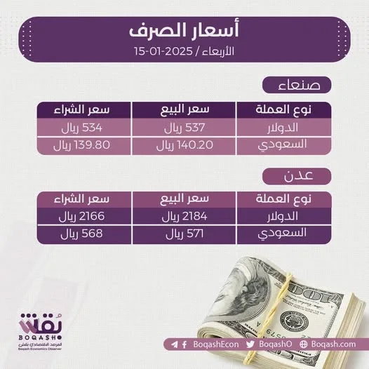 جدول أسعار الصرف في اليمن 15-1-2025 اليوم في صنعاء وعدن