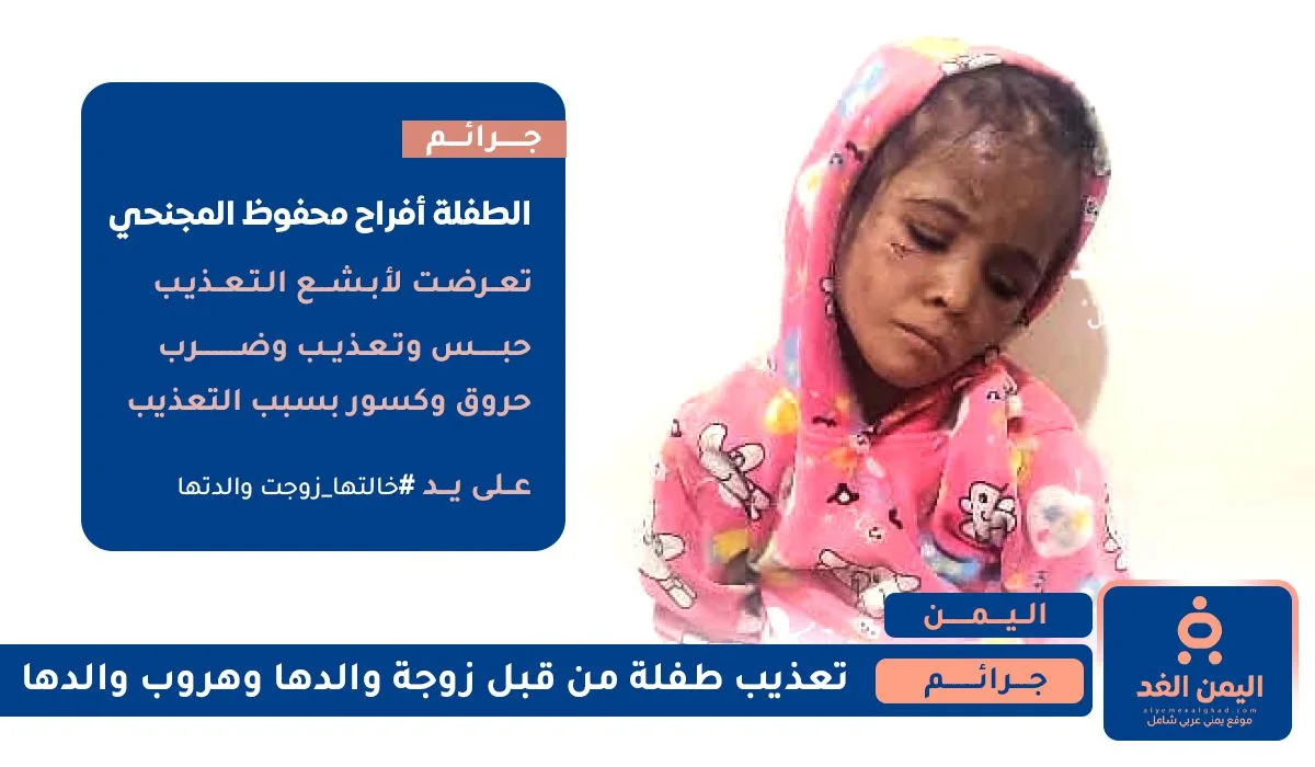 جريمة بشعة بحق الطفولة تعرضت لها الطفلة أفراح محفوظ المجنحي على يد زوجة والدها, حيث قامت الخالة بتعذيبها لأشهر طويلة وحرق جسدها بالنار وشعرها وضربها بالفأس “العطيف” مما أدى إلى كسور في جسدها.