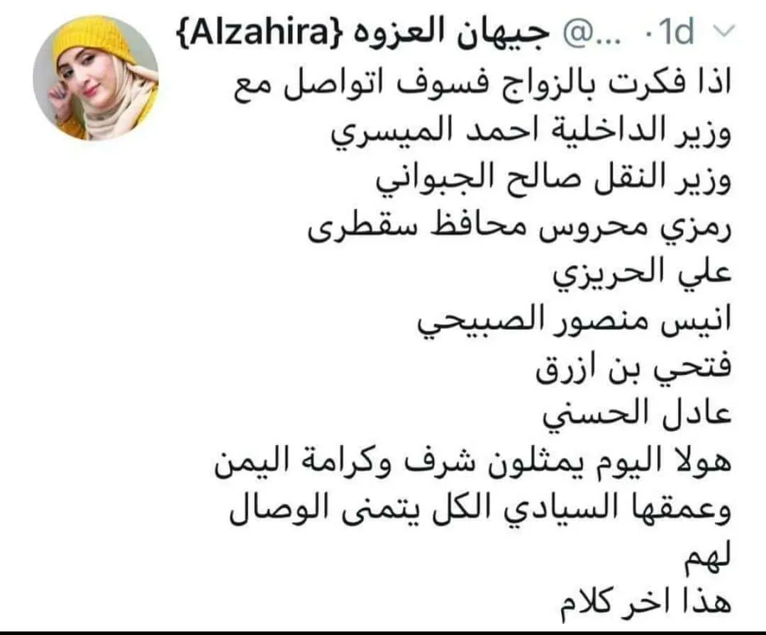 إذا فكرت بالزواج فسأتواصل مع وزير الداخلية المهندس أحمد الميسري، أو وزير النقل صالح الجبواني، أو محافظ سقطرى رمزي محروس، أو علي الحريزي أو أنيس منصور الصبيحي أو فتحي بن لزرق أو عادل الحسني”.