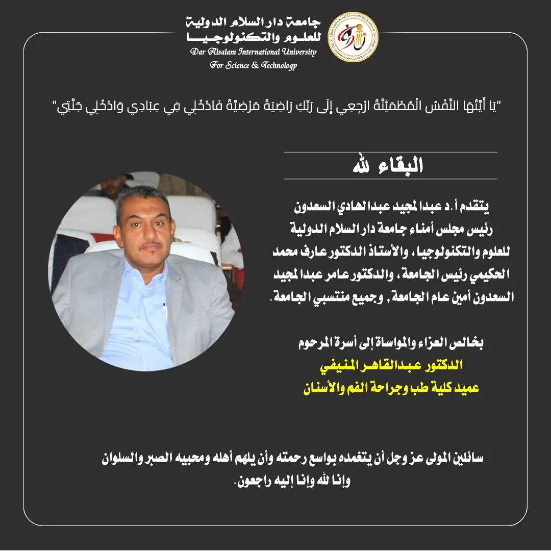 يتقدم الأستاذ الدكتور عبدالمجيد عبدالهادي السعدون رئيس مجلس أمناء جامعة دار السلام الدولية للعلوم والتكنولوجيا، والأستاذ الدكتور عارف محمد الحكيمي رئيس الجامعة، والدكتور عامر عبدالمجيد عبدالهادي السعدون أمين عام الجامعة، وجميع منتسبي الجامعة.