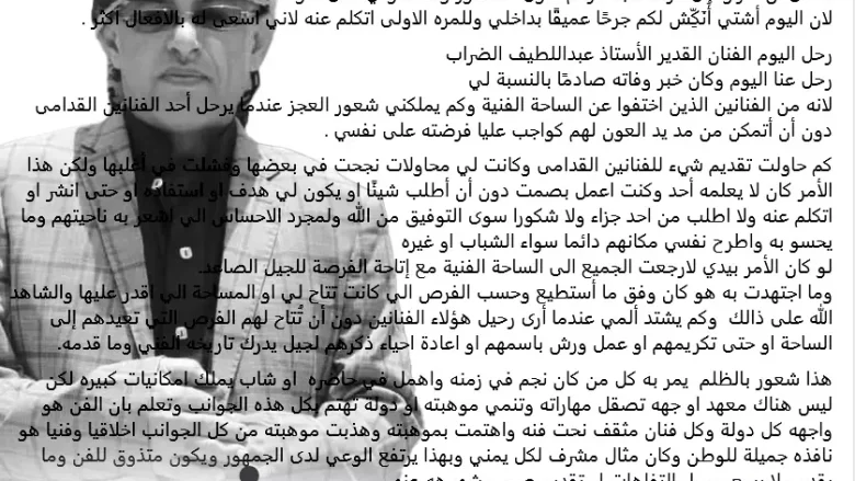 وفاة الفنان عبداللطيف الضراب بعد صراع مع المرض وبعد معاناة بعد الغياب الطويل عن الساحة الفنية اليمنية لعدة أسباب, يُغادر كما غادر الكثيرون من الفنانين اليمنيين الذين لم يتمكنوا من الإستمرار في العمل التلفزيوني.