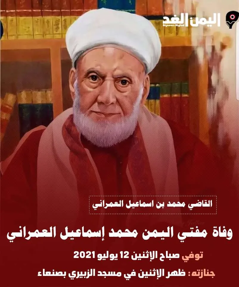 تَوفى صباح اليوم الإثنين 12-7-2021 العلامة والقاضي محمد بن إسماعيل العمراني عن عمر ناهز 99 عام وذلك بعد صراع كبير مع المرض, وأعلن نجله عن وفاة والده صباح يوم الإثنين.