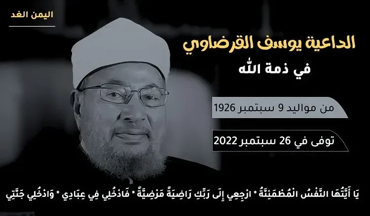 بعد الإعلان الرسمي من قبل حساب الداعية المفكر الدكتور يوسف القرضاوي عبر تويتر عن وفاة يوسف القرضاوي بعد صراع طويل مع المرض, وتوفى الشيخ القرضاوي عن عمر ناهز 96 عام , وهو من مواليد سبتمبر 1926 وتوفي يوم الإثنين 26 سبتمبر 2022.