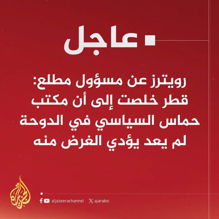 وفي ذات السياق، أوردت قناة الجزيرة القطرية نقلًا عن رويترز أن قطر توصلت إلى أن المكتب السياسي لحماس في الدوحة لم يعد يؤدي الغرض من وجوده.