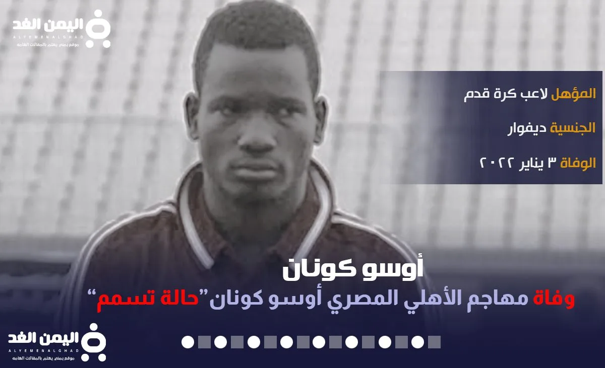 سبب وفاة أوسو كونان مقتل مهاجم الأهلي والمقاصات من هو Oussou Konan والذي توفى إثر تعرضه لتسمم وتوفى على إثر التسمم , ومن خلال المقال سوف نتعرف على بعض المعلومات التي تم التبين منها خلال الساعات الماضية إلى هذه اللحظة عبر اليمن الغد تابعونا.